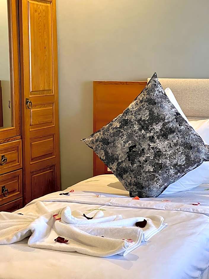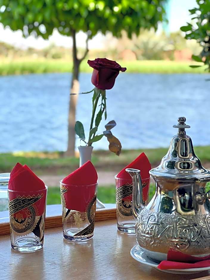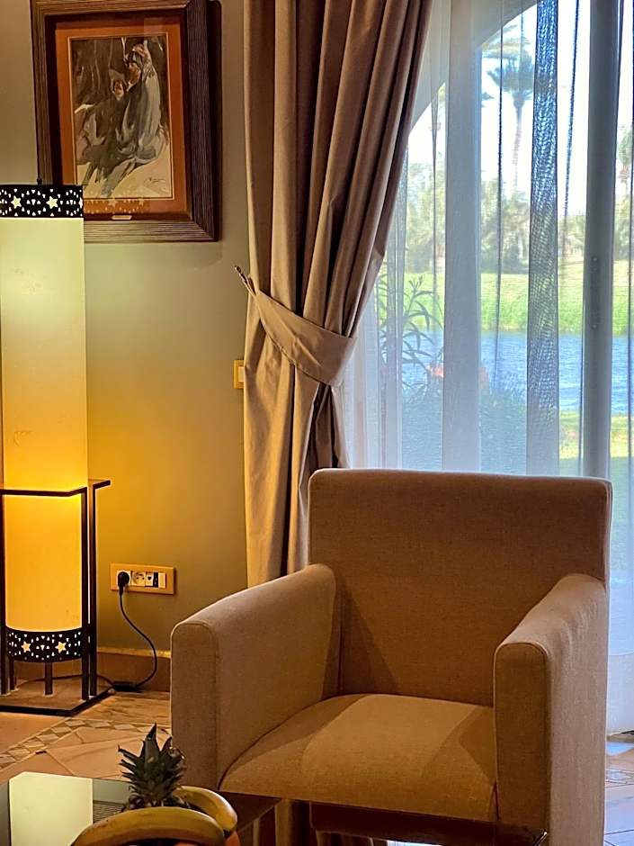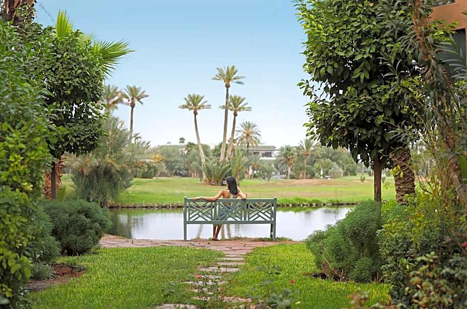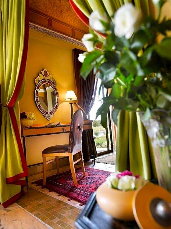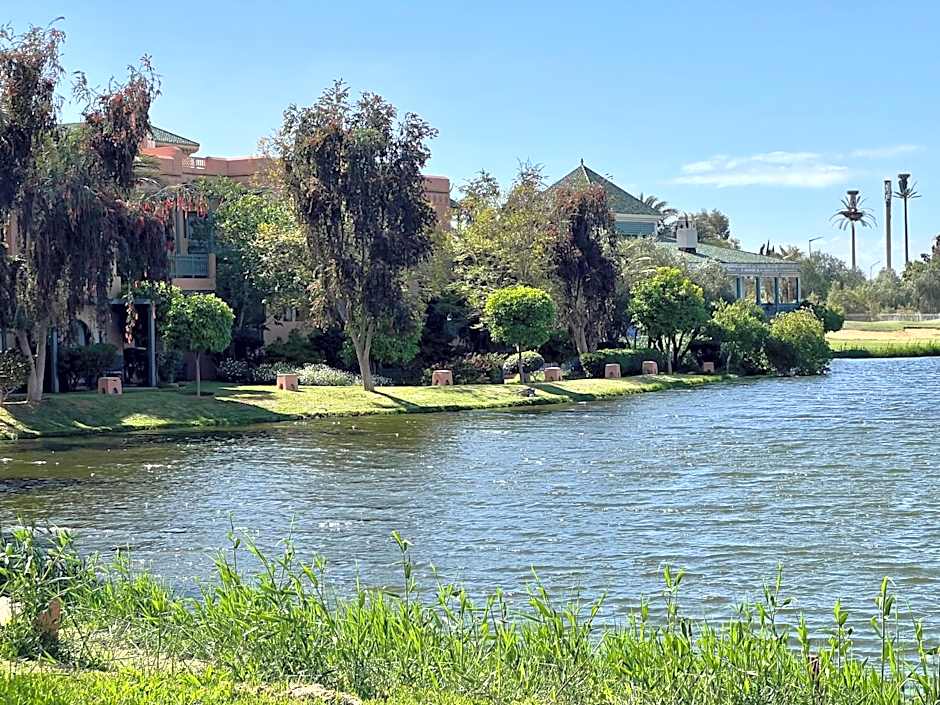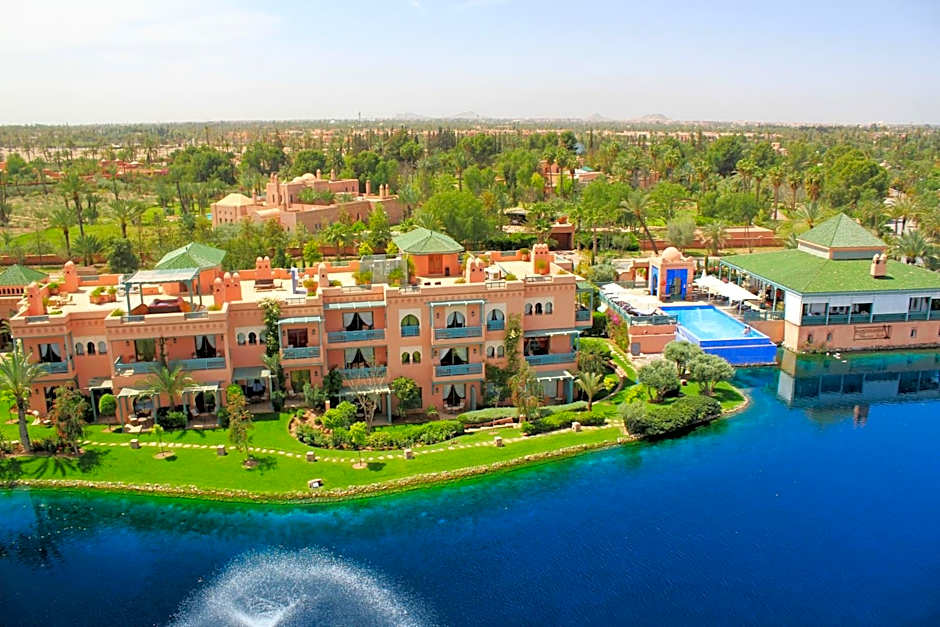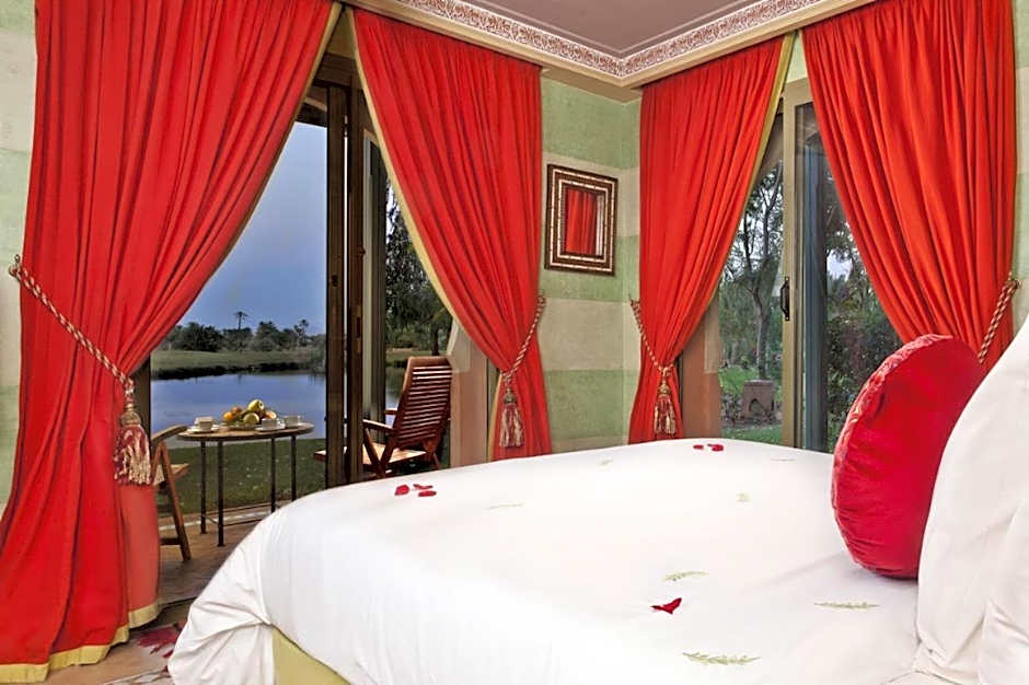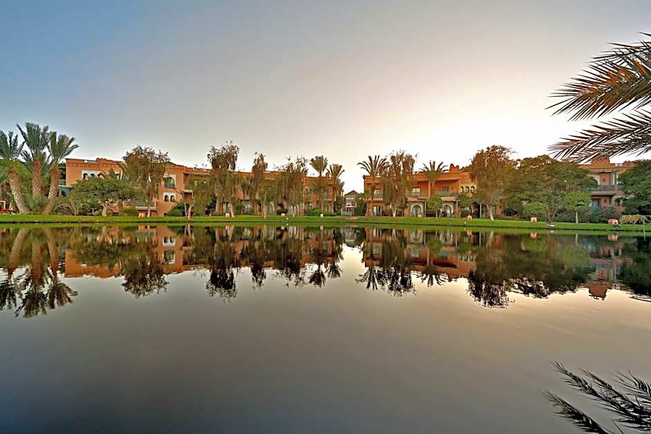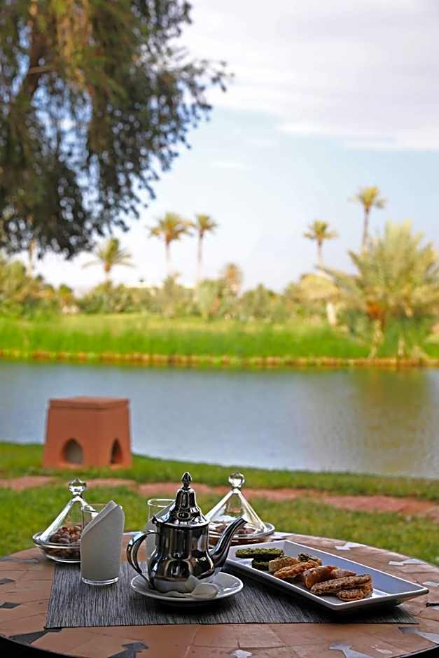 Guests can relax in the outdoor swimming pool or unwind on the sun terrace with sun loungers and parasols, offering stunning views of the lake and the 27-hole golf course. Additional amenities include a welcoming lobby, currency exchange services, and a complimentary shuttle to the city center for convenient access to Marrakesh’s attractions.